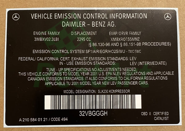 Vehicle Emission Control Information Daimler Benz Mercedes SLK Label 2105840121